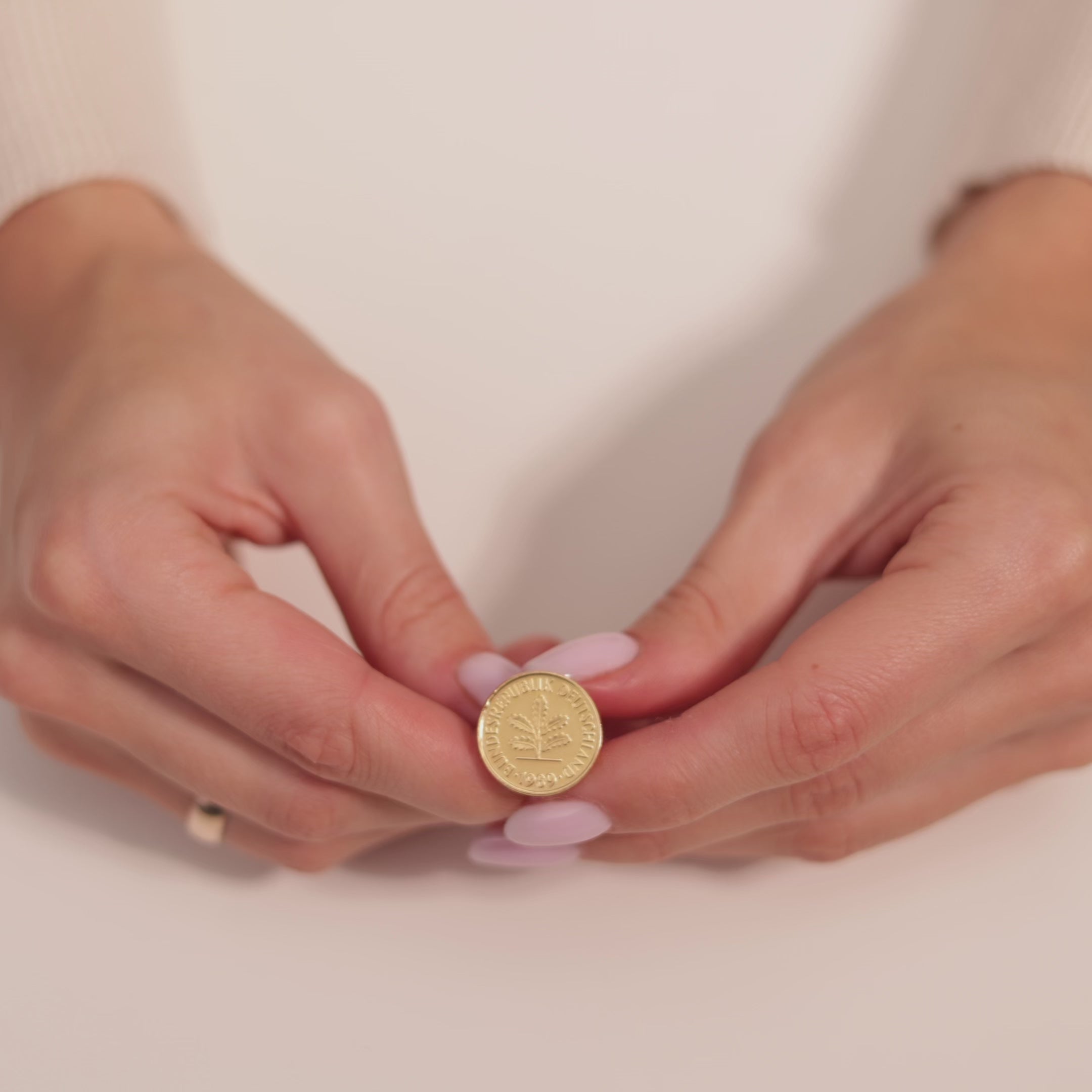 Caractéristiques du produit : Fabriqué à partir d'une authentique pièce allemande de 5 pfennigs, plaqué or pour une patine vintage éclatante. Diamètre de la pièce : 18,50 mm. Doté d'un fermoir papillon sécurisé et d'une broche de 8 mm pour un port élégant et confortable.