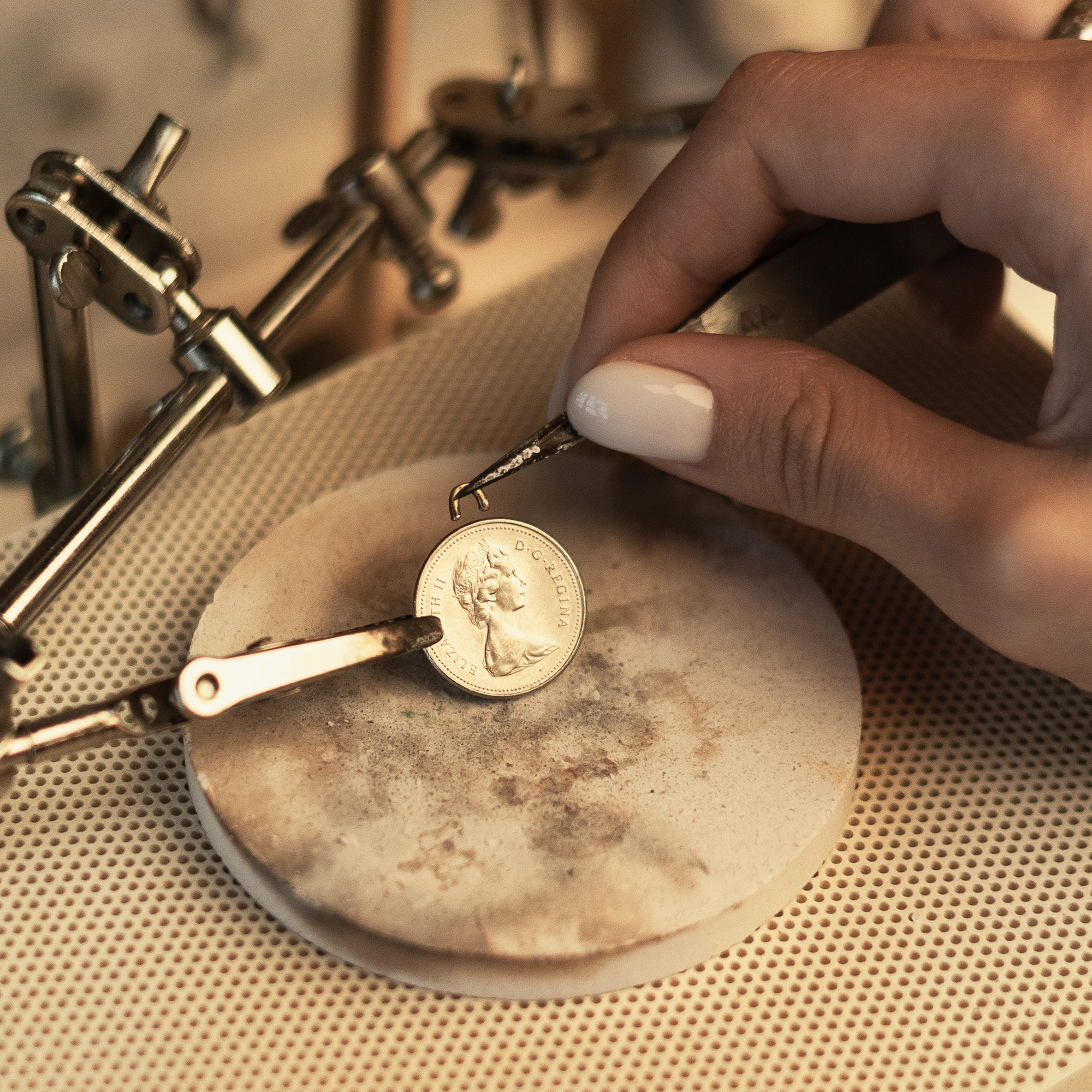 Nous avons fabriqué ces bijoux à la main à partir de véritables pièces de monnaie frappées. Chaque pièce porte les marques subtiles du temps : de légères rayures et cicatrices, acquises au fil des ans, de main en main. Ces magnifiques traces d'histoire ne font que rehausser le caractère de chaque pièce, célébrant son caractère unique.