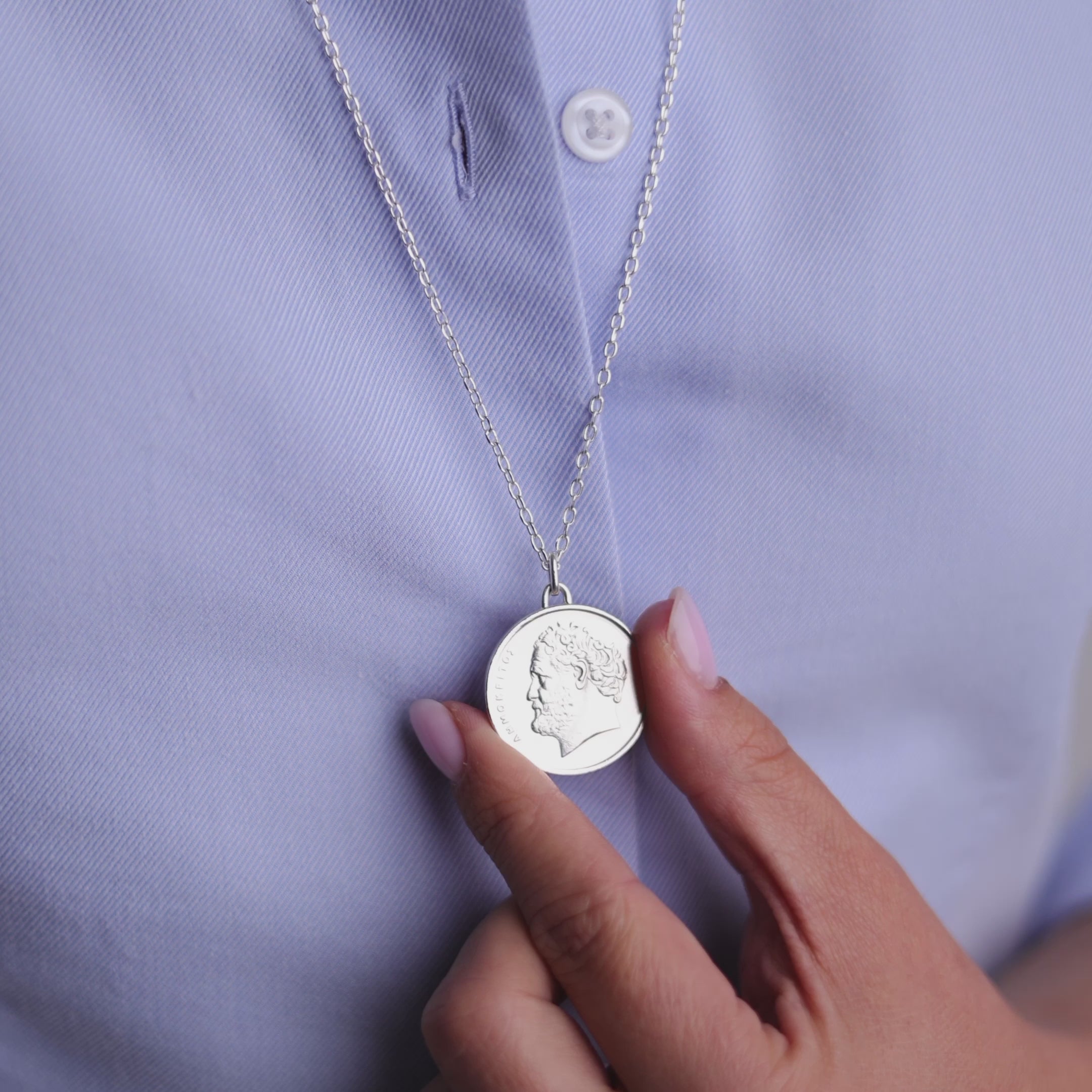 Collier avec pièce grecque | Pendentif médaillon | 10 drachmes plaquées rhodium | Démocrite | 1976-2000