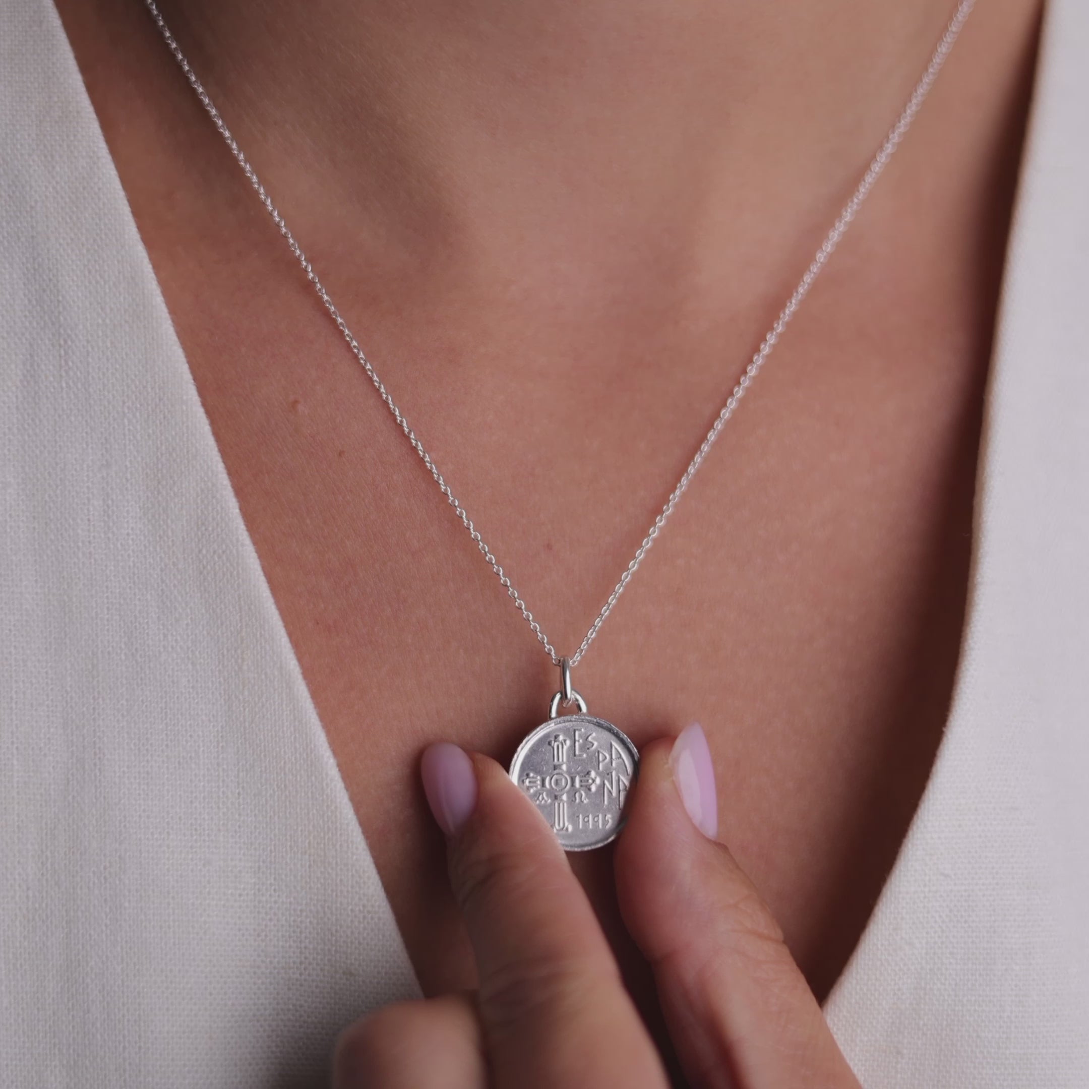 Collier avec pièce de monnaie espagnole | Pendentif médaillon | 5 pesetas plaquées rhodium | Asturies | 1995