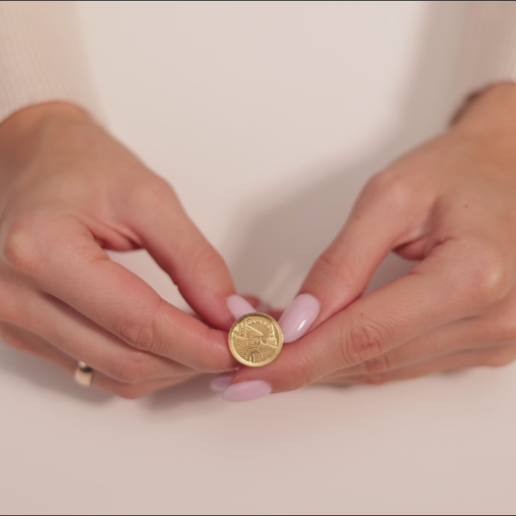 Your jewelry piece arrives elegantly packaged in a beautiful Prometto gift box, complete with a soft pouch. Inside, you'll also find a microfiber wipe, thoughtfully included to help you care for your piece and shield it from dirt and environmental factors. Additionally, the package includes a certificate that guarantees the authenticity and origin of the coin—an important testament to its value. Be sure to keep this certificate safe, as it adds to the story and legacy of your cherished piece.